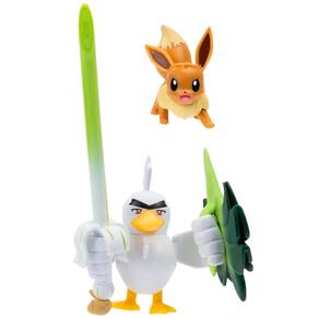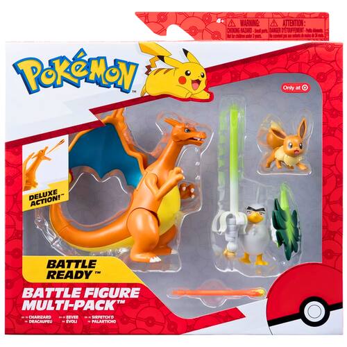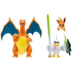 Descrição do produto : " Conjunto com três figuras Pokémon em diferentes tamanhos e tipos: Eevee 5cm, Sirfetch’d 7cm e Charizard 11cm Representando os tipos Normal, Lutador e Fogo. As figuras apresentam acabamento fiel ao visual da série animada Pokémon, com detalhes autênticos que destacam expressões, posturas e efeitos de batalha, como o disparo de míssil de fogo do Charizard. A figura de Eevee é compatível com os acessórios Clip N Go e Carry Case Playset (vendidos separadamente). : "