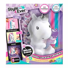 Figura de Decorar - Style 4 Ever - Unicórnio Brilha no Escuro Grande - Fun Divirta-se : as crianças vão se divertir brincando de decorar o Unicórnio com LED Multicolorido Style 4 Ever. Ele vem acompanhado de canetas, cartela de adesivos, mechas de cabelo para que as pequenas possam personalizar o Unicórnio com seu próprio estilo. Além disso, esse brinquedo é ideal para decorar o ambiente de casa, pois possui led multicolorido deixando a iluminação suave e aconchegante, ideal para quartos, salas de estar, escritórios e espaços de lazer. Detalhes: • 2 em 1: Brinquedo e Luminária • Figura para decorar • Brilha no Escuro (Glow in the Dark) • Luminária com luz LED multicolorida e suave • Com acessórios destacáveis, adesivos, mechas de cabelo e canetas marcadores • Você pode criar seus próprios penteados com mechas adesivas e removíveis (Limpe o adesivo com água morna para recuperar sua aderência e reutilizá-lo) • Personalize seu unicórnio escolhendo o acessório do momento: gelo, skate, prancha de surfe ou microfone • Basta destacar esses elementos pré-cortados da embalagem e colocá-los entre os braços • Compartimento na base em forma de nuvem ideal para armazenar pequenos objetos (joias, scrunchies, presilhas, moedas ...) • Unicórnio de vinil, perfeito para decorar um quarto durante o dia e relaxar à noite com a sua luz suave Informações: • Produto: Figura Decore seu Unicórnio Glow In The Dark Grande • Marca: Fun Divirta-se • Coleção: Style4Ever • Tipo: Brinquedo 2 em 1 - Figura e Luminária LED • Categoria: Artes e Atividades • Conteúdo: - 01 Unicórnio com LED multicolorido para decorar - 01 Cartela com adesivos - 02 Apliques de cabelo - 04 Acessórios de decoração destacáveis - 04 Canetas • Recomendação: para crianças a partir de 06 anos de idade Especificações: • Referência: F0150-7 • Código de Barras: 7908489407828 • Embalagem (C x A x L): 21.7 x 22 x 10 cm • Embalagem (Peso): 0.482 kg • Alimentação: utiliza 02 pilhas de 1.5v (não incluídas) • Material / Composição: Plástico e Vinil • Registro: 003 342/2024 • Certificado: Órgãos Autorizados - OCP´S (Organismos de Certificação de Produtos) Aviso: • As imagens são meramente ilustrativas • Os pesos, tamanhos e medidas são aproximados • As cores e estampas dos produtos podem ter variações • As informações são de responsabilidade do fabricante ou fornecedor