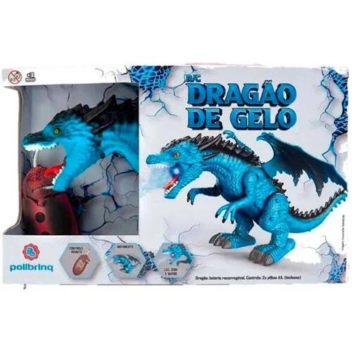 Figura Eletrônica Com Controle - Robô - Dragão De Gelo - Polibrinq Figura Eletrônica com Controle - Robô - Dragão de Gelo - Polibrinq: os pequenos e pequenas fãs de Dinossauros e Dragões viverão aventuras incríveis. Com movimentos, efeitos sonoros e luzes, o Dragão de Gelo da Polibrinq é o brinquedo ideal para presentear as crianças no aniversário, Dia das Crianças ou Natal. Ao colocar água, o Dragão de Gelo dispara ar gelado com luz LED. As crianças controlam os movimentos por controle remoto. O Dragão de Gelo possui movimentos nas patas, cabeças e asas. Além disso, reproduz sons de dragão e luzes.Informações:- Produto: Robô Dragão de Gelo com Controle Remoto- Marca: Polibrinq- Tipo: Figura Interativa- Cor: Azul e preto- Categoria: Figuras de Animais e Pets- Subcategoria: Figuras Eletrônicas- Conteúdo: - 01 robô- 01 cabo de carregamento usb - 01 controle remoto- Recomendação: para crianças a partir de 04 anos de idadeEspecificações:- Referência: DG053- Código de Barras: 7898706182587- Embalagem (C x A x L): 30 x 20 x 13 cm- Embalagem (Peso): 0.550 kg- Composição / Material: PVC e ABS- Alimentação: - Dragão: 01 Bateria 800 mAh 3.7V- Controle: 02 Pilhas AA 1.5V- Registro: 001828/2022- Certificado: Órgãos Autorizados - OCPS (Organismos de Certificação de Produtos)Benefícios de brincar:- Eleva a autoestima- Exercita a memória- Estimula o raciocínio- Exercita o imaginário- Desenvolve a criatividade- Desenvolve percepção visual- Desperta a atenção e curiosidade- Desenvolvimento neuropsicológico- Estimula habilidades motoras básicas- Incentiva a comunicação e linguagem- Desenvolve aspectos emocionais e afetivo- Estimula o reconhecimento de formas e coresAviso: - As imagens são meramente ilustrativas- Os pesos, tamanhos e medidas são aproximados- As cores e estampas dos produtos podem ter variações- As informações são de responsabilidade do fabricante ou fornecedor