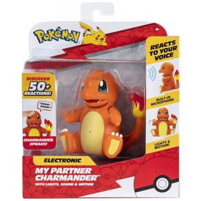 A figura eletrônica My Partner Charmander é um brinquedo interativo que utiliza sensores de toque e um microfone integrado para responder à voz e aos estímulos da criança com movimentos, luzes e sons temáticos de Pokémon. O personagem movimenta braços e boca, acende a chama da cauda e emite efeitos sonoros característicos, permitindo simular expressões de alegria, irritação, cansaço e ações de ataque inspiradas na série animada.