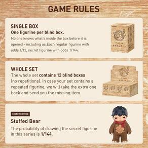 - Design aleatório: as caixas cegas são totalmente aleatórias e não podemos aceitar solicitações de itens específicos. As chances de obter a edição secreta geralmente são de 1/144. Ao comprar o conjunto completo, não haverá figuras duplicadas.