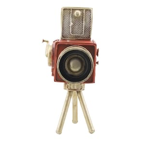 Filmadora Com Tripé 22.5Cm Estilo Retrô - Vintage Enfeite decorativo no formato de uma filmadora vermelha com tripé e 22.5 cm de altura. Possui uma caixinha no topo que serve como porta objeto. Produto exclusivamente com função decorativa. Material: metal