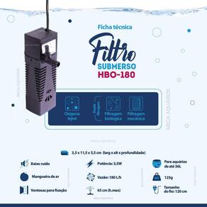 Ficha técnica: Marca: HBO Modelo: filtro interno HBO-180 Potência: 3.5W Vão: 180 L/h Voltagem: bivolt Hmax: 65cm altura máxima que a bomba consegue elevar a água Indicado para aquários de até: 36L Medidas: 3,5 x 11,5 x 5,5 cm larg x alt x profundidade Tamanho do fio: 120 cm Peso: 125g