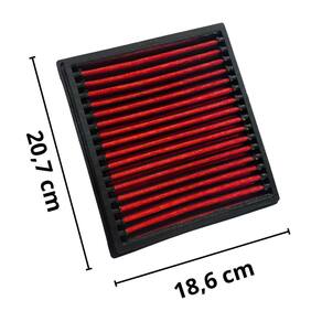 As medidas do filtro são 20,7cm x 18,6cm, garantindo um encaixe perfeito no seu veículo. Além disso, acompanha o filtro de ar esportivo, um manual de lavação, um chaveiro premium e dois adesivos.