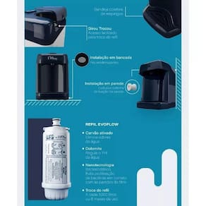 Filtro Purificador evolution de água natural possui nanotecnologia contra bactérias e certificação inmetro - O purificador evolution é perfeito para quem quer praticidade- Não utiliza energia elétrica- Refil girou trocou- Fácil instalação- Purificador de água naturalConta com nanotecnologia que evita proliferação de bactérias em contato com paredes do filtro, dolomita para regular o ph da água e carvão ativado que reduz o cloro. Elimina odores e gosto ruim da águaCaracterísticas técnicas da filtragem de água do refil evoflow:Vida útil: 3000 litros ou 6 mesesPressão máxima: 70 mca 700kpa Pressão mínima: 2,5 mca 25 kpa Vazão: 60 litros/horaEnsaios de desempenhoEficiência da retenção de partículas: classe cEficiência da redução de cloro livre: aprovadoEficiência bacteriológica: não se aplicaEnsaios realizados de acordo com a nbr 16098:2012Conta com vários benefícios para a sua famíliaPush bottom.Alta vazão.Gabinete em plástico de alta resistênciaMedidas do purificador: 28,3 cm de altura e 20 cm de largura, e 20 cm de profundidadeEconomia: purifica até 3.000 litros de água com um único filtro ou até 6 meses de uso para troca do refilPeso do purificador: 1,2 kg- ítens inclusos:- 1 purificador evolution- 1 refil evoflow já instalado - 1 mangueira para alimentação da rede de água- kit para instalação em parede parafusos / bucha e suporte plástico - Manual do usuário