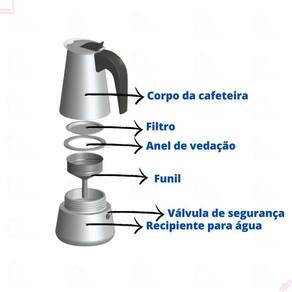 Conteúdo da embalagem: 1 filtro de cafeteira italiana 2 xícaras com borracha de silicone