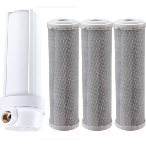 Filtro Central Transparente 9.3/4 e x03 Elemento Filtrante Carbon BlockEncaixe/vedaçãoAltura: 9.3/4 polegadasØ Externo: 2,5 polegadasDimensões do produto comp x larg x alt : 71,0 x 71,0 x 248,5 mmComposição Elemento Filtrante: Carvão Ativado Compacto - Origem VegetalComposição Acabamentos: tampas, TNT e Tela em Polipropileno PP / Arruelas de Vedação em Elastômero AtóxicoTemperatura de Operação: Máx. 70 °C / Mín. 1 °CPressão de Operação: Máx. 40 mca 4,0 bar / Mín. 2 mca 0,2 bar Classe Retenção Partículas micra - ¿m : 5¿mEficiência Redução Cloro Livre: Aplicável Redução acima de 75% Extraíveis: AplicávelVazão Máxima Recomendada: 200 Litros/HoraO Kit contém: X1 Filtro central X3 Refil carvão ativado remove cloro