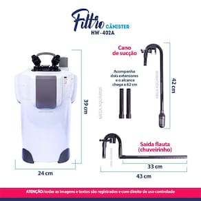 DICAS: 1 - Para manter um bom desempenho da bomba e da filtragem, realize a limpeza do filtro e das mídias a cada 7 dias. Lavar apenas com água corrente. 2 - Insira as mídias mais pesadas nas camadas de baixo cerâmica, carvão, Matrix, Zeolite etc , assim você garante maior estabilidade ao cânister e evita que ele tombe. 3 - Faça um mix de mídias para que você obtenha uma tripla filtragem: química, biológica e mecânica.