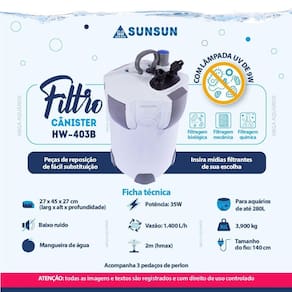 Especificações técnica: Marca: Sunsun Modelo: Sunsun HW-403B Potência: 35W Voltagem: escolha a voltagem na lateral do anúncio Vazão: 1400 L/h Hmax: 2m altura máxima que a bomba consegue elevar a água Lâmpada: UV UV-C ultravioleta germicida 9W - PL 2 pinos Indicado para aquários de até: 280L Medidas: 27 x 45 x 27cm larg x alt x profund Tamanho do fio: 140 cm Peso: 3,900 Kg
