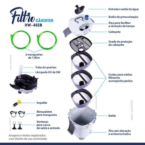 Itens inclusos na embalagem: 1 Cabeçote com bomba e impeller 1 Suporte para entrada e saída de água 1 Grade de proteção do cabeçote 1 Lâmpada UV germicida de 9W 3 Cestas para mídias 3 Pedaços de perlon 1 Balde com presilhas 2 Ventosas para suporte dos canos 2 Abraçadeiras 2 Mangueiras de 1,90m 1 Cano de sucção 1 Grade de proteção para sucção 2 Extensores para cano de sucção 1 Saída flauta desmontável