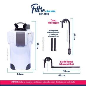 Especificações técnica: Marca: Sunsun Modelo: Sunsun HW-402A Potência: 18W Voltagem: escolha a voltagem na lateral do anúncio Vazão: 1000 L/h Hmax: 1.4m altura máxima que a bomba consegue elevar a água Indicado para aquários de até: 200L Medidas: 24 x 39 x 24cm larg x alt x profund Tamanho do fio: 140 cm Peso: 2,610 Kg
