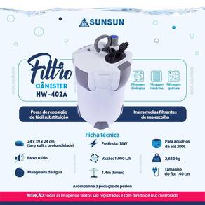 Os filtros cânister Sunsun, são ideais para quem busca um equipamento prático, de fácil manutenção, confiável e de ótimo custo-benefício. Sua principal característica é a possibilidade de escolha das mídias filtrantes que serão utilizadas de acordo com a necessidade do seu aquário ou lago, além disso, possui saída tipo flauta que auxilia na oxigenação na água.
