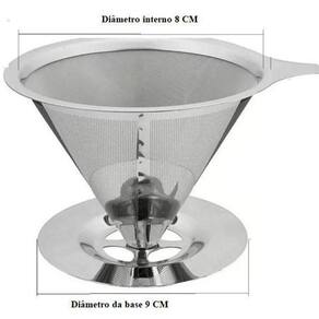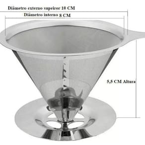 Filtro Coador De Café Em Aço Inox Ø100 Mm - Ecológico Não necessita de filtros de papel Produto em Inox de alta qualidade desenvolvido e fabricado pela marca especialista em produtos para sua cozinha . A passagem da água pelo pó de café de maneira uniforme resulta em uma bebida mais consistente, tempo de filtragem importante para acentuar os sabor do café. Características: Material do Filtro: Aço Inox Tamanho:Diâmetro superior aproximadamente 10 cmDiâmetro interno aproximadamente 8 cmDiâmetro inferior na base aproximadamente 9 cmAltura aproximadamente 5,5 cm