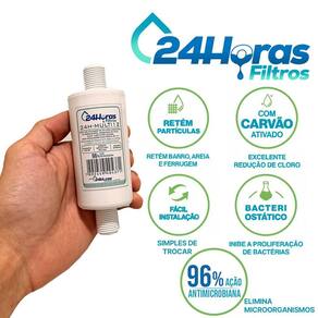 Filtro Compatível Igatu 731 Rosca 1/2 Multiuso 60l/h Pressão Filtro 24H-MULTI12 Compatível Igatu 731 Rosca 1/2 Multiuso 60l/h P/ap Por Pressão, Purificador de Água Universal. - Filtro Universal com Roscas de 1/2 na entrada e saída. - Pequeno: Cabe em qualquer lugar, de baixo da pia, etc. - Fácil adaptação em qualquer ponto de água, bebedouro, torneira, máquina de lavar, máquina de café, máquina de gelo, etc. - Pode ser como pré filtro de outro purificador, maximizando a eficiência da filtragem. - Longa duração: Filtro deve ser trocado de 6 a 6 meses. - O filtro elimina: Cloro, Gostos, Cheiros, Partículas Sólidas e ajuda a Elevar o pH. As marcas e produtos citados e ilustrados são propriedades de seus respectivos fabricantes e aparecem apenas para demonstrar a compatibilidade deste produto. --------------------------------------------------------------------------- Marca: 24 Horas Filtros Eficiência da retenção de partículas: Classe III Eficiência da redução de Cloro livre: Aprovado Eficácia Anti-Microbiana 96%: Aprovado Produto de acordo com a norma ABNT NBT 16098:2012. Elemento filtrando destinado ao uso em água que atenda a portaria N 2.914 do Ministério da Saúde. Marca: Não Informado