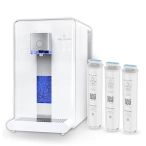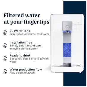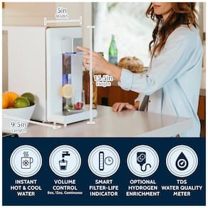 É possível ter água instantânea quente, fria ou em temperatura ambiente, ideal para café ou chá. Indicadores inteligentes de vida útil do filtro e display TDS Total de Sólidos Dissolvidos fornecem qualidade da água em tempo real. Possui ainda uma função opcional de enriquecimento de hidrogênio molecular. A bandeja coletora é removível para copos e garrafas de todos os tamanhos e fácil limpeza.