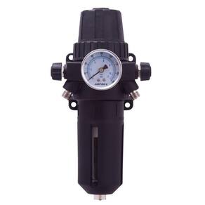 Constituídos de um só conjunto, o Filtro e Regulador de Ar além de eliminar a umidade, filtra o óleo e as impurezas do ar comprimido mantendo sua pressão constante, a qual é indicada por um manômetro. Os Filtros Reguladores são utilizados em todos os serviços de pintura, quando se exige um suprimento de ar limpo, isento de umidade e perfeitamente regulado a determinada pressão. A regulagem da pressão de ar é feita através de uma válvula tendo como guia um manômetro indicativo . Filtro de ar deve ser instalado o mais próximo do equipamento a ser utilizado , evitando-se assim , a condensação de água na linha à partir do mesmo. Recomenda-se efetuar a drenagem várias vezes ao dia ( se necessário), com a finalidade de extrair a água, óleo e resíduos acumulados.