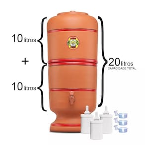 Características: Filtro de barro com capacidade de armazenar 10 litros de água em cada reservatório. Durabilidade e qualidade água naturalmente fresca e saudável, feito à mão em argila e reduz impurezas presentes na água. Especificação do Filtro: Produto com certificação INMETRO em purificação. Capacidade: 10 litros por reservatório. Medidas: Altura 61 cm e Diâmetro 24 cm. Peso: aprox. 13,3 kg. : 06 meses contra defeito de fabricação. Itens incluso: 01 Manual de uso e montagem produto de fácil montagem . 03 Velas tradicional velas com porcas e arruelas de vedação . 03 Boias de para duplicar a capacidade do filtro. 01 Torneira. 01 Reservatório superior. 01 Reservatório inferior. 01 Tampa. Manutenção: Higienização: usar somente esponja limpa e água. Manutenção das velas: as velas devem ser substituídas a cada 6 meses. Marca: Não Informado Ean: 7898080080103