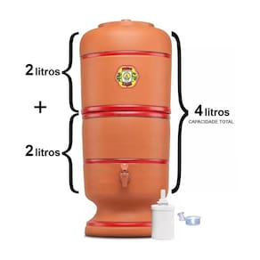 Características: Filtro de barro com capacidade de armazenar 4 litros de água no total sendo 2 litros na parte superior e 2 litros na parte inferior; Durabilidade e qualidade água naturalmente fresca e saudável, feito à mão em argila e reduz impurezas presentes na água; Especificação do Filtro: Produto com certificação INMETRO em purificação. Capacidade: 2 litros por reservatório. Medidas: Altura 40 cm e Diâmetro 16 cm. Peso: aprox. 4 kg. Garantia: 12 meses - Defeito de Fabricação Itens incluso: 01 Manual de uso e montagem (produto de fácil montagem). 01 Vela Tradicional (vela com porca e arruelas de vedação). 01 Boia para duplicar a capacidade do filtro mantendo os 2 reservatórios sempre cheios. 01 Torneira. 01 Reservatório superior. 01 Reservatório inferior. 01 Tampa. Manutenção: Higienização: usar somente esponja limpa e água. Manutenção das velas: as velas devem ser substituídas a cada 6 meses ou antes dependendo da qualidade da água a ser filtrada.