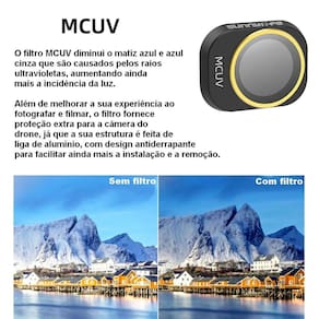 Filtro de lente mcuv para drone dji mini 4 pro Filtro de lente mcuv para drone dji mini 4 pro Com o filtro mcuv da sunnylife feito especificamente para o dji mini 4 pro, você conseguirá melhorar ainda mais a qualidade das suas fotos e vídeos, pois ele reduz a quantidade de luz e permite com que a câmera selecione o valor de exposição correto, evitando a superexposição. Além disso, o filtro mcuv diminui o matiz azul e azul cinza que são causados pelo raio ultravioleta, aumentando ainda mais a incidência da luz. Além de melhorar a sua experiência ao fotografar e filmar, o filtro também fornece proteção extra para a câmera do drone, pois a sua estrutura é feita de liga de alumínio, com design antiderrapante para facilitar ainda mais a instalação e a remoção. Também conta com revestimento multicamada de dupla face que garante um protetor à prova d&39;água, à prova de óleo, à prova de poeira e anti-riscos de primeira classe, dando a você a liberdade de experimentar diferentes possibilidades criativas Principais vantagens: - fácil instalação - fácil remoção - material resistente - proteção extra Modo de usar: 2. Alinhe com os orifícios e gire o filtro no sentido horário 3. Pronto Dados técnicos: Marca: sunnylife Modelo: n4p-fi721 Material: alumínio + vidro óptico Peso: 0.7g Compatibilidade: Compatível com drone dji mini 4 pro Itens inclusos: 1x filtro de lente mcuv 1x caixa de transporte Drone não incluso Imagens meramente ilustrativas de 90 dias após o recebimento do produto Esta é válida para todo o território nacional, e ela cobre defeitos de fabricação. Para maiores informações consulte o site do fabricante ou contate-nos pelos nossos canais de atendimento. Por que comprar seu equipamento com a proaventura Marca: Não Informado Ean: 6110250017391