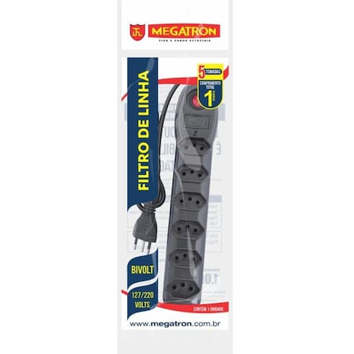 FILTRO DE LINHA 06 TOM. PP 3X0,75X1,00MT 2P+T PT MEGATRONOs Filtros de linha Megatron podem ser utilizados nas redes 127V e 220V (Bivolt) e possuem Fusível que é acionado automaticamente na ocorrência de sobrecarga ou curto circuito. São ideais para proteger equipamentos eletrônicos de curtos e sobrecargas.Modelo: Filtro de Linha BivoltAmperagem: 10A / 250VCabo: PPComprimento Total : 1,00mEspessura do cabo: 0,75mm²Número de tomadas: 5 ou 6Ideal para: Proteger eletroeletrônicos, como televisores, home-theater, vídeo games, computadores, impressoras, telefones, entre outros.*Imagens meramente ilustrativa.*Marca: MegatronCódigo79899