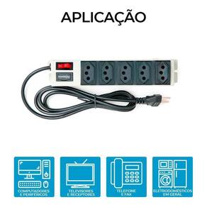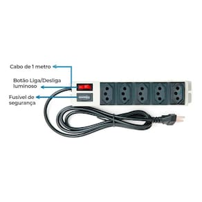 Filtro de linha 5Tomada é um dispositivo de segurança que protege equipamentos eletrônicos contra surtos de energia, ruídos de rede provenientes de descargas atmosféricas e picos de tensão, preservando e aumentado a vida útil dos mesmo, tendo um correte máxima do conjuntos de tomada em 10 ampere, potência máxima do conjunto em 1270va em 127v; 2200va em 220v, tendo o cabo condutor em cabo pp conforme a norma regulamentador NM 247-5 de 1 metro e tendo plugue e tomadas conforme a norma regulamentadora, plugue conforme NM 60884-1 e tomada conforme NBR 14.136.