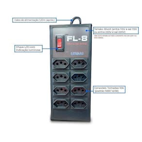 Filtro de linha com protetor de tensão 8 Tomadas Com Fio Fabricados em gabinete plástico injetado de alto impacto possuem design moderno e proporcionam proteção aos equipamentos eletroeletrônicos em geral, estão disponíveis em diversas configurações de tomadas. Aplicações: - Residência - Eletroeletrônicos - Informática - Áudio e vídeo - Eletrodomésticos - Vídeo Game Aplicações Típicas - Informática - Periféricos - Telefonia - Segurança - Aparelhos eletro-eletrôicos em geral. ATENÇÃO: A tensão de entrada do protetor é igual à tensão de saída. O protetor não transforma a tensão de 220V para 115V ou vice-versa. Destaques: - Bivolt - Chave L/D com indicação luminosa - Elementos de filtragem Características Técnicas: - Potência Máxima: 1150VA/W em 115V ou 2200VA/W em 220V - Tensão: Bivolt entra 115V e sai 115V ou entra 220V e sai 220V - Corrente máxima: 10 A por tomada ou 10 A no conjunto - Freqência: 50 / 60 Hz - Conexões: Tomadas 10A e Cabo de alimentação com plugue / 1,20m apróx. padrão NBR 14136 - Gabinete: Plástico ABS : 12 meses por defeito de fabricação Características Tensão: Bivolt entra 115V e sai 115V ou entra 220V e sai 220V Corrente máxima: 10 A por tomada ou 10 A no conjunto Conexões: 10A e com plugue padrão NBR 14136 Comprimentos do cabo: 1,20m aprox : 12 meses por defeito de fabricação Marca: Não Informado