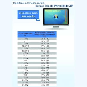 Filtro de privacidade 19,5 w9 hb004389142 3mnotebooks vieram para modernizar a vida cotidiana, eles oferecem toda a tecnologia dos desktops, porém com a vantagem da mobilidade, mas se por um lado temos a liberdade de usá-los em qualquer lugar, por outro temos o inconveniente de ter pessoas observando o que é feito no computador. O filtro de privacidade protegerá suas informações confidenciais através de uma exclusiva tecnologia, que bloqueia a visão dos dados da sua tela para pessoas que estiverem acima de um ângulo de 60º em relação ao centro do monitor. Somente a pessoa que estiver posicionada frontalmente ao notebook terá a visão perfeita, sem distorções do visor. Também protege as telas contra riscos e impressões digitais e mantém o nível de proteção de brilho-reflexo. O filtro pode ser utilizado em monitores de várias marcas e modelos. Não é necessário remover o filtro de privacidade ao fechar o notebook, para conservá-lo, basta removê-lo, colocá-lo em uma superfície lisa e limpá-lo com pano umedecido com água. Compre agora o seu perguntas e respostas: como descobrir as medidas da tela do seu monitor área visível primeiro, determine se o seu dispositivo tem uma moldura elevada ou uma tela de vidro frontal plana essas telas têm vidro de ponta a ponta sem moldura elevada. Em seguida, meça sua tela de acordo com o tipo de tela que você possui meça a altura e a largura da área visível da tela, certificando-se de medir dentro da moldura meça a altura e a largura de todo o visor de vidro, certificando-se de medir de ponta a ponta não consegue encontrar suas medidas exatas dica de melhor ajuste: selecione um filtro que seja maior, mais próximo de suas medidasoutras especificações: não distorce a imagem do monitor bloqueia em até 60% o brilho/reflexo glare pode ser utilizado em monitores ou notebooks de várias marcas e modelos protege a tela contra riscos, arranhões e impressões digitais fácil instalação e permite que aplique e remova quantas vezes quiser produto com simples face na cor fumê fácil sistema de fixação para inserção e remoção do produto. Não é preciso retirá-la quando fechar a tela do notebook para conservá-lo, basta removê-lo, colocá-lo numa superfície lisa e limpá-lo com pano umedecido com água, seque bem e reinstaleitens inclusos01 filtro de privacidade01 manual do usuário01 pano de limpeza01 par de etiquetas destacáveis e autoadesivas para a fixação