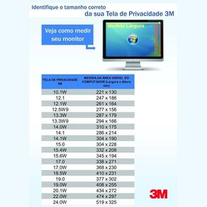 O filtro de privacidade 3M bloqueia a visão lateral do seu computador em um ângulo de 60°, a partir do centro da tela, permitindo que as pessoas que estão ao seu lado não enxerguem as informações que você visualiza. Possui exclusiva tecnologia de privacidade composta por microestruturas que propiciam que os dados sejam apenas visíveis para pessoas que estejam diretamente posicionada em frente ao monitor, sem deformação da imagem. Além da função de segurança, protege as telas de LCD contra riscos e impressões digitais e reduz o brilho e reflexo da tela. Mantém a confidencialidade das informações em qualquer lugar, tanto no escritório quanto em locais públicos, como aeroporto, restaurantes, cafés, etc. Fácil sistema de fixação para inserção e remoção do produto. Não é necessário remover o filtro de privacidade quando o notebook é fechado. Para conservá-lo, basta removê-lo, colocá-lo numa superfície lisa e limpá-lo com pano levemente umedecido com água. Feito isso, seque o produto e reinstale-o. O Filtro de Privacidade pode ser usado em monitores LCD ou notebooks de várias marcas e modelos.ATENÇÃO: Verifique as medidas (Largura e altura) da área visível do seu monitor/notebook antes de escolher o tamanho do seu filtro de privacidade 3M. Podem existir diferenças de tamanhos em telas de computadores de uma mesma polegada.