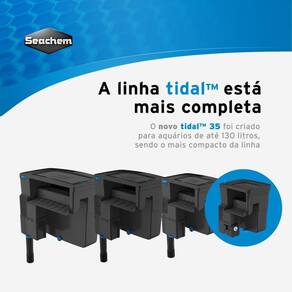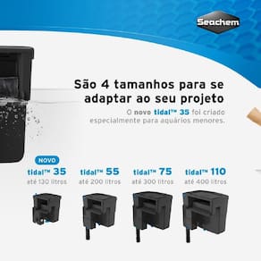 Filtro Seachem Tidal 110 para aquários de até 400 Litros Para ficar completamente seguro com o seu sistema de filtragem, a Seachem lançou o filtro Tidal 35, um investimento com alta tecnologia que irá manter seu aquário limpo e saudável com o mínimo de manutenções pelos próximos anos. O modelo Tidal 35 foi desenvolvido especificamente para Seachem pela empresa italiana Sicce, muito bem elaborado para garantir a mais alta qualidade e alto desempenho possível. Principais características • Baixo consumo em relação ao grande fluxo de água permitindo economia de energia com excelente circulação; • Funcionamento silencioso, mesmo para os mais silenciosos ambientes da casa ou do escritório; • A bomba permite arranque fácil e confiável; • Baixa manutenção e cuidado do aquário em longo prazo; • Impeller auto limpante reduzindo necessidade de manutenção da bomba; • Partes e peças não corrosivas que permite o utilização em aquários de água doce ou salgada; • Alta capacidade da cesta de filtração permitindo a utilização de praticamente todas as mídias filtrantes; • Inclui Seachem Matrix ™ que remove completamente amônia, nitrito e nitrato; • A cesta de filtração removível permite fácil limpeza; • A tampa do filtro funciona como uma bandeja segura para cesta de filtragem, evitando derramamento de água durante a limpeza remota; • Frestas de ventilação permitem reforçar o fluxo de ar e as trocas gasosas; • Perfil comprimido reduz a interferência na fixação do aquário; • O sistema de nivelamento permite o posicionamento exato na parede do aquário; • Skimmer de superfície para filtragem de orgânicos e espuma da superfície da água do aquário; • Fluxo ajustável permitindo a utilização de forma versátil em uma variedade de aquários; • Captação de água ajustável entre a superfície e a profundidade, permitindo um melhor ajuste das áreas específicas a ser filtrada; • Tubo de captação telescópico permite regular em qualquer profundidade; • O suporte para aquecedor permite a dispersão segura do calor através do fluxo de água do filtro; • O retorno de água pela parede transversa oferece fendas de aeração para aumentar redox e aeração do aquário; • O monitor de manutenção mostra quando o filtro precisa de limpo. Especificações Técnicas • Indicado para aquários de até 400L; • Produto já inclui bomba; • Vazão máxima de 2000L/h; • Potência de 12W – 60Hz (127V) e 10W – 50Hz (220v); • Volume do filtro de 3,2L; • Dimensões: 29,5 x 17,4 x 25cm; • Disponível nas voltagens 127V e 220V; • Garantia de 3 + 2 anos de fábrica Fabricado pela Seachem/Sicce - Itália Produto importado