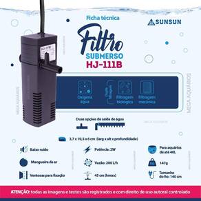 Filtro Sunsun hj-111b interno dupla filtragem com saída comum ou tipo flauta - 200L/h para aquários pequenos de até 40L Os filtros submersos Sunsun, são ideais para quem busca um equipamento prático, de fácil manutenção, confiável e de ótimo custo-benefício, possui saída tipo flauta que auxilia na oxigenação da água, realiza dois tipos de filtragem, biológica e mecânica. Características: Baixo consumo de energia Dupla filtragem Filtro esponja propicia o crescimento de bactérias para filtragem biológica e mecânica Silencioso Resistente Fácil instalação, limpeza e manutenção Possui ventosas para fixação Refil de fácil Ótimo custo benefício Saída tipo chuveirinho que auxilia na oxigenação da água Acompanha mangueira de ar para auxílio na oxigenação Acompanha dois bicos de saída: comum e saída flauta O filtro necessita ficar totalmente submerso Especificações técnica: Marca: Sunsun Modelo: Sunsun hj-111b Potência: 2W Vazão: 200 L/h Hmax: 45cm altura máxima que a bomba consegue elevar a água Indicado para aquários de até: 40L Medidas: 3,7 x 10,5 x 6cm larg x alt x profund Altura total com a flauta: 13cm. Comprimento da flauta: 11,5cm Tamanho do fio: 140 cm Peso: 147g Itens inclusos na embalagem: 1 Bomba Sunsun 1 Filtro com esponja 1 Bico de saída de água comum 1 Saída de água tipo flauta / chuveirinho 1 Mangueira de ar silicone 1 Manual em português Manutenção: Realizar a limpeza da bomba e das esponjas a cada 7 dias. Obrigado pela visita e boas compras ATENÇÃO Nossas imagens e textos são registrados e com direito de uso autoral controlado e reservado a essa loja e as lojas parceiras devidamente autorizadas em contrato. Ean: 7793299480730
