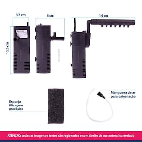 Filtro Sunsun hj-111b interno dupla filtragem com saída comum ou tipo flauta - 200L/h para aquários pequenos de até 40L Os filtros submersos Sunsun, são ideais para quem busca um equipamento prático, de fácil manutenção, confiável e de ótimo custo-benefício, possui saída tipo flauta que auxilia na oxigenação da água, realiza dois tipos de filtragem, biológica e mecânica. Características: Baixo consumo de energia Dupla filtragem Filtro esponja propicia o crescimento de bactérias para filtragem biológica e mecânica Silencioso Resistente Fácil instalação, limpeza e manutenção Possui ventosas para fixação Refil de fácil Ótimo custo benefício Saída tipo chuveirinho que auxilia na oxigenação da água Acompanha mangueira de ar para auxílio na oxigenação Acompanha dois bicos de saída: comum e saída flauta O filtro necessita ficar totalmente submerso Especificações técnica: Marca: Sunsun Modelo: Sunsun hj-111b Potência: 2W Vazão: 200 L/h Hmax: 45cm altura máxima que a bomba consegue elevar a água Indicado para aquários de até: 40L Medidas: 3,7 x 10,5 x 6cm larg x alt x profund Altura total com a flauta: 13cm. Comprimento da flauta: 11,5cm Tamanho do fio: 140 cm Peso: 147g Itens inclusos na embalagem: 1 Bomba Sunsun 1 Filtro com esponja 1 Bico de saída de água comum 1 Saída de água tipo flauta / chuveirinho 1 Mangueira de ar silicone 1 Manual em português Manutenção: Realizar a limpeza da bomba e das esponjas a cada 7 dias. Obrigado pela visita e boas compras ATENÇÃO Nossas imagens e textos são registrados e com direito de uso autoral controlado e reservado a essa loja e as lojas parceiras devidamente autorizadas em contrato. Marca: Não Informado