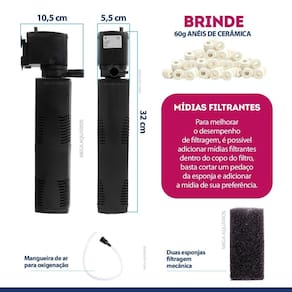 Filtro Sunsun JP-023F interno submerso filtragem mecânica e biológica - 1000L/h para aquários de até 200L Acompanha 60g de mídia filtrante anéis de cerâmica. Os filtros submersos Sunsun, são ideais para quem busca um equipamento prático, de fácil manutenção, confiável e de ótimo custo-benefício, possui entrada de mangueira de ar para auxilio na oxigenação da água, realiza dois tipos de filtragem, biológica e mecânica. Características: Baixo consumo de energia Dupla filtragem Filtro esponja propicia o crescimento de bactérias para filtragem biológica e mecânica Auxilia na oxigenação Silencioso Resistente Possui ventosas para fixação Refil de fácil Ótimo custo benefício Acompanha mangueira de ar para auxilio na oxigenação O filtro necessita ficar totalmente submerso Serve para aquário marinho e de água doce DICAS: 1 - É possível adicionar mídias filtrantes dentro do copo do filtro, basta cortar um pedaço da esponja e adicionar carvão ativado, anéis de cerâmica, perlon, purigen, OceanPure entre outras. Basta atentar-se ao peso do filtro, as mídias não devem passar de 250g. 2 - Para manter um bom desempenho da bomba, realize a limpeza da bomba e das esponjas a cada 7 dias. Lavar apenas com água corrente. Especificações técnica: Marca: Sunsun Modelo: Sunsun JP-023F Potência: 16W Voltagem: Escolha a voltagem no botão próximo ao botão de compras Vazão: 1000 L/h Hmax: 1.3m altura máxima que a bomba consegue elevar a água Indicado para aquários de até: 200L Medidas: 5,5 x 32 x 10,5 cm larg x alt x profund Tamanho do fio: 140 cm Peso: 445g Itens inclusos na embalagem: 1 Bomba Sunsun 1 Filtro com 2 esponjas 1 Mangueira de ar silicone 60g de anéis de cerâmica Obrigado pela visita e boas compras ATENÇÃO Nossas imagens e textos são registrados e com direito de uso autoral controlado e reservado a essa loja e as lojas parceiras devidamente autorizadas em contrato.