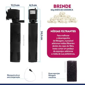 1 - É possível adicionar mídias filtrantes dentro do copo do filtro, basta cortar um pedaço da esponja e adicionar carvão ativado, anéis de cerâmica, perlon, purigen, OceanPure entre outras. Basta atentar-se ao peso do filtro, as mídias não devem passar de 350g.