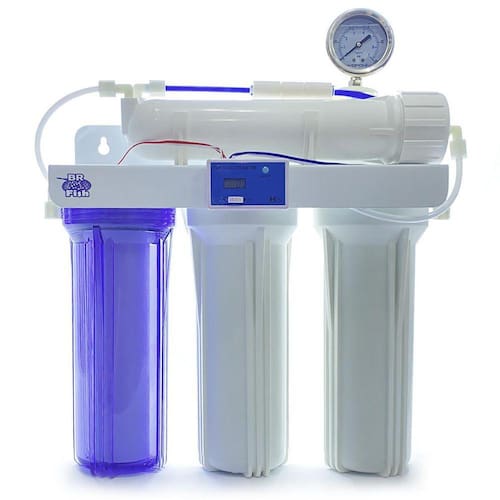 Uma Carcaça Transparente 10 Duas Carcaças Branca 10 Chave para abrir as carcaças Suporte Triplo de Ferro que pode ser pendurado na parede Elemento filtrante Polipropileno 10 5 Micras Elemento filtrante Carbon Block 10 5 Micras Cartucho Recarregável 10 Resina Mista Purolite MB-478 Carcaça para membrana de OR Membrana de RO 100 GPD Conectores cotovelo com encaixe Restritor de Fluxo Mangueira 5 Metros Conector para Torneira. Manômetro Hydronix / ZYIA mesmo fabricante Hydronix . Medidor TDS In-Line HM Dual Entrada e Saída Durabilidade da membrana 12 a 18 meses A resina mista dura em media de 1200 litros