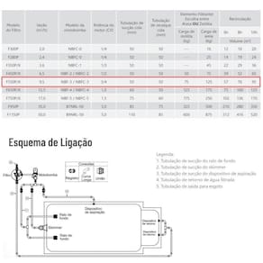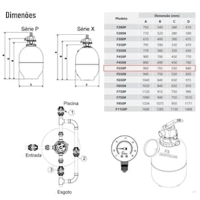 Diâmetro: 550mm Peso: 14,2kg Motobomba recomendada: NBF-3 Modelo do filtro: F550P Vazão: 9,5m/h Quantidade de sacos de areia: 5 Quantidade de sacos zeolita: 3 Área filtrante: 0.24m Volume piscina: 40.000 a 57.000 L