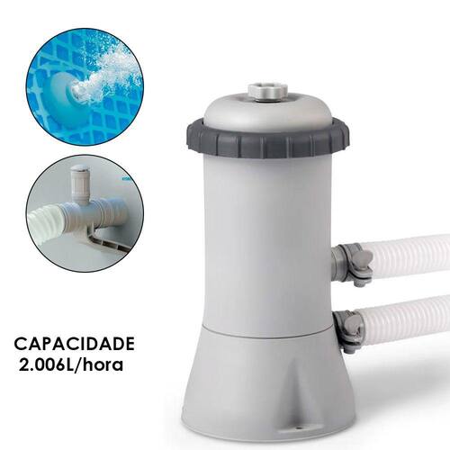Filtro para piscina de armação Easy Set 2006L hora INTEXCaracterísticas:Sendo uma solução prática para fazer a filtragem das piscinas de solo, a bomba filtro para piscina de armação Intex Easy Set 2.006L/h é uma bomba filtrante de 45W de potência tipo A, que já vem com o filtro incluso, indicada para piscinas acima do solo de até 8.592 litros.Compatível com diversos modelos de piscinas Intex ela mantém a qualidade da água sempre boa e cristalina. Possui elemento filtrante de fácil remoção para substituição ou limpeza, basta remover a tampa superior do Filtro e substituir o cartucho, a durabilidade do cartucho varia de acordo com intensidade do uso e da qualidade da água.Especificações:- Marca: Intex- Modelo: 28603 (110V) / 28604 (220V)- Voltagem: 110V ou 220V- Potencia: 45 W- Capacidade de filtragem: 2.006 litros por hora- Indicação: para piscinas até 8.592 litros- Cartuchos: Tipo A- Material: PVC Pneumático- Dimensões (L x A x C): Largura: 28 cm x 37 cm x 26 cm- Peso: 2,54KgItens que acompanham:- 1 par de mangueiras- 2 pares de braçadeirasIMAGENS MERAMENTE ILUSTRATIVAS