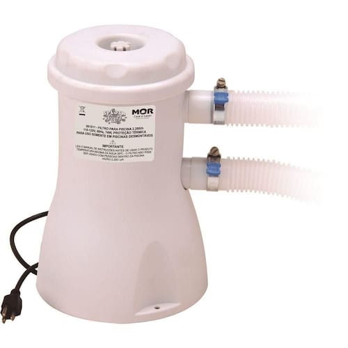 Filtro para piscina mor 2200 l/h 127v 1511 filtro para piscina mor 2200 l/h 127v 1511em tempo de preocupação ambiental, o uso consciente da água é fundamental. O filtro piscina mor possui capacidade de filtragem de 2. 200 litros por hora, o que reduz também o gasto de energia, tornando mais rápido, eficaz e econômico o tratamento da água da sua piscina. Esse filtro é recomendado somente para uso em piscinas desmontáveis. Para um bom funcionamento, o seu refil deve ser trocado a cada três meses quando utilizado constantemente. Com 110v, acompanha duas mangueiras de 1,5 metros e é compatível com o refil código 001498. Atenção é muito importante que você verifique se a voltagem do filtro é compatível com sua região. Além disso, nunca ligue-o sem água dentro para não correr o risco de queimar o produto. Especificações