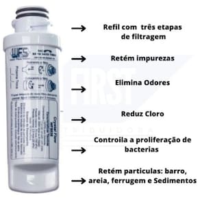 O filtro remove o cloro da água, elimina sabores, retém partículas de sujeira, barro, ferrugem, eleva o Ph.