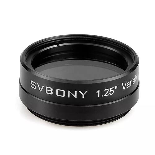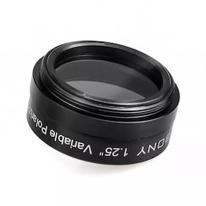 Ao observar a Lua ou planetas, muitas vezes há muita luz que tira os detalhes sutis. Esse problema pode ser evitado usando filtros de densidade neutra ou polarizadores. O Filtro Polarizador Variável 1.25" desempenha este papel ainda melhor devido o empilhamento de dois filtros de polarização, combinando-os em conjunto com um anel especial. Ao rodar os dois elementos, a transmissão de luz pode ser variada entre cerca de 2% e 40%. Este filtro retém balanço de cor real já que todos os comprimentos de onda são transmitidos de maneira uniforme ao longo de todo o espectro.