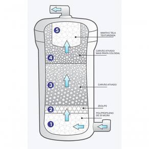 Material natural com efeito bactericida e bacteriostático (eficiência bacteriológica conforme NBR 14908), que remove metais pesados (chumbo, níquel, cromo, manganês, , mercúrio e cobre), amônia, turbidez, cor, sabor e preserva os sais minerais.