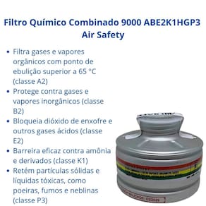 Filtro Químico Combinado 9000 ABE2K1HGP3 Air Safety Proteção Total para Gases e Partículas Segurança sem concessõesFiltro combinado A2B2E2K1P3 desenvolvido para ambientes com múltiplos contaminantes, garantindo ar limpo e protegido. O Filtro Químico Combinado 9000 ABE2K1P3 oferece barreira completa contra vapores orgânicos (A2), vapores inorgânicos (B2), gases ácidos (E2), amônia e derivados (K1) e partículas tóxicas (P3). Compatível com respiradores da série 9000, é ideal para quem necessita de versatilidade num único elemento filtrante.