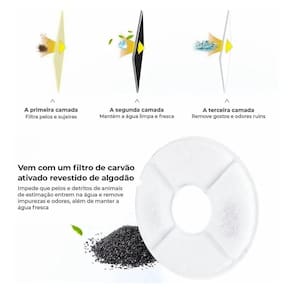 A qualidade da água pode ser removida pelos três 3 tipos de filtração. A camada externa de algodão em cada filtro captura cabelo e detritos. Três etapas de filtração podem garantir a qualidade da água e realçar o sabor da água pura para seus gatos.