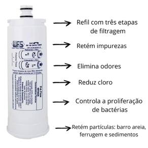 Código: wfs028. Vida útil: 3000 litros. Vazão: 50/60 litros/hora. Retenção de partículas: classe c 5 a 15 micra . Sem redução de cloro livre.