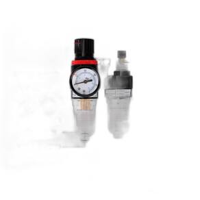 = Modelo: Filtro Eliminador De Água E Lubrificador de Óleo Com Regulador Pressão 1/4'' = Fluido: Ar Comprimido = Rosca de Entrada: 1/4 =rosca de Saída: 1/4 = Pressão de Trabalho: 0 a 10 Bar =vazão a 7 Bar: 1/4 BSP: 2300 L/Min. = Fixação: Suporte Cantoneira = Capacidade do copo: 0,15 L = Corpo: Alumínio = Copo: Policarbonato