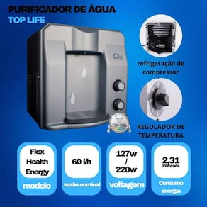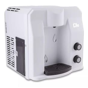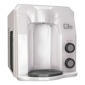 Purificador de água alcalina ionizada Top Life HE, com pH entre 8,5 e 9,5, ORP de -177, 8 etapas de purificação, refrigeração por compressor, e capacidade de refrigeração de 2,48 Litros/hora.Função retrolavagem
