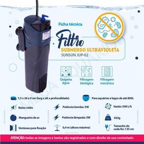 O filtro Sunsun JUP-02 germicida é um sistema de esterilização altamente eficiente, realiza a filtragem biológica da água, eliminando vírus, bactérias, algas e fungos por meio da radiação ultravioleta C, deixando a água limpa, cristalina e proporcionando um ambiente mais saudável para os animais aquáticos. É um produto indispensável para quem tem um lago ou aquário, o esterilizador germicida complementa a filtragem mecânica e biológica.