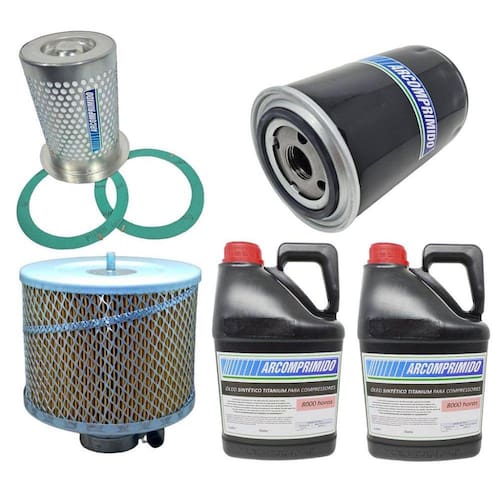 Kit de Filtros e 10L de Óleo Sintético Similares para Compressor Techto Supreme SD15. O kit contém: * 01 Filtro Separador de Ar e Óleo * 01 Filtro de Óleo * 01 filtro de Ar * 10L de Óleo Sintético 8000hrs