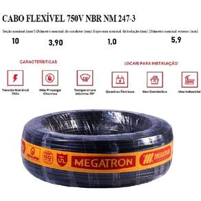 Fio Cabinho Flexível Preto Megatron 10,0 mm Rolo com 100 metros Código Do Produto: BT404254RF - Fabricante: Megatron Condutor de cobre eletrolítico flexível com classe 4 de encordoamento Isolados com composto termoplástico tipo PVC/70°C, composto termoplástico Tipo anti chama, indicado para tensão até 750v.Norma aplicável: NBR NM 247-3 ABNT Secção nominal 10, 0 mm Diâmetro nominal do condutor: 3,9 mmEspessura nominal: 1,0 mmDimensional externo: 5,9 mm Aplicação: Quadros ElétricosUso IndustrialUso Doméstico Imagem Meramente Ilustrativa