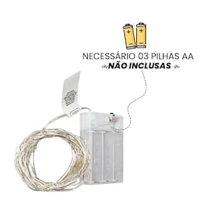 Para utilizar o fio de fada, você precisará de 3 pilhas AA não inclusas . Com 100 leds, o fio possui uma potência de 03W e 0,02A. O espaçamento entre os leds é de 10cm.
