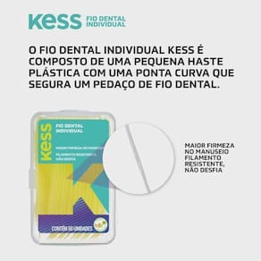 O Fio Dental Individual Kess é composto de uma pequena haste plástica com uma ponta curva que segura um pedaço de fio dental. Na sua outra extremidade, ele possui uma ponta afinada, que pode ser utilizada para auxiliar na remoção de partículas de comidas presas nos espaços interdentais ou na linha da gengiva. Por ser de fácil utilização, é indicado também para pessoas com limitações motoras. Sua caixa vem com 50 unidades.